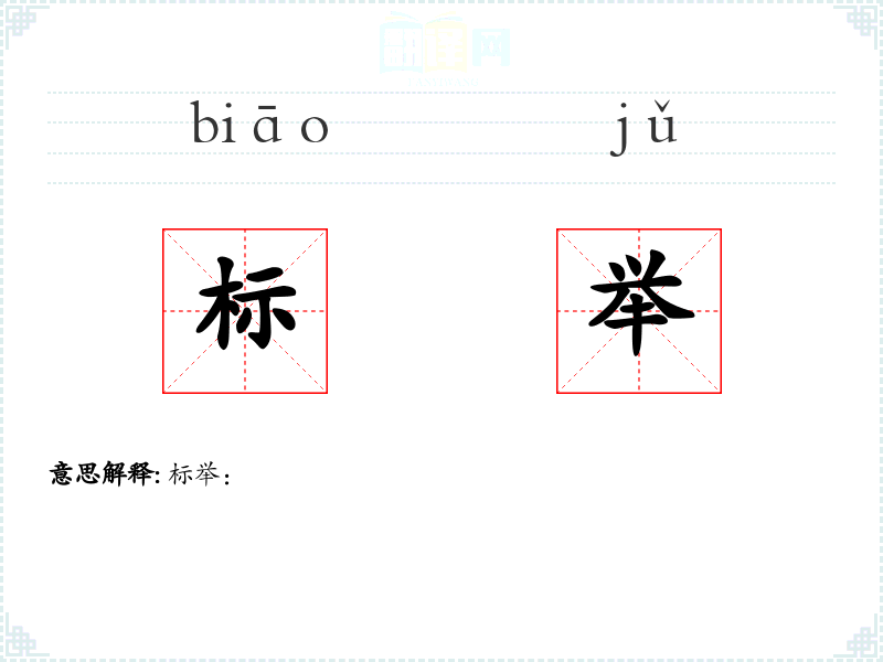 - 词源:标举由两个汉字组成,标(标记)和举(举起),在古代汉语中已有使用,如《左传》中有“标举其事”的用法。