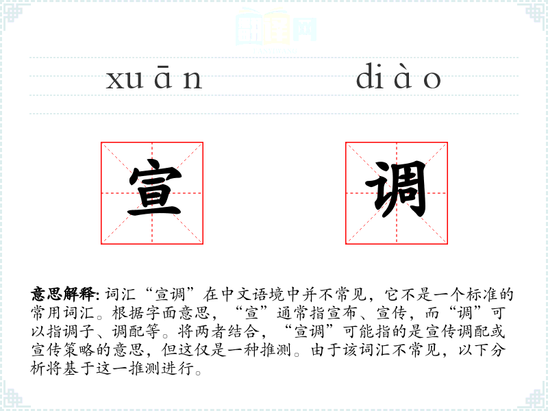 由于“宣调”不是一个常用词汇,其词源和演变不明确。可能是近年来在特定领域(如市场营销、政治宣传)中新兴的词汇。