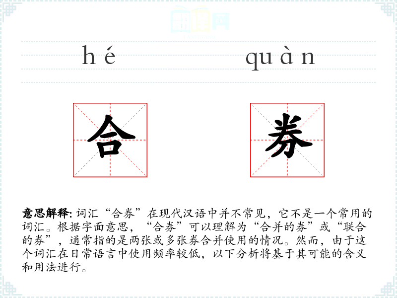 词汇“合券”在现代汉语中并不常见,它不是一个常用的词汇。根据字面意思,“合券”可以理解为“合并的券”或“联合的券”,通常指的是两张或多张券合并使用的情况。然而,由于这个词汇在日常语言中使用频率较低,以下分析将基于其可能的含义和用法进行。