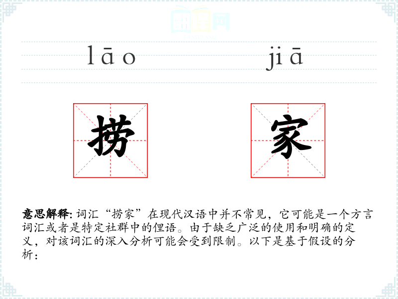 词汇“捞家”在现代汉语中并不常见,它可能是一个方言词汇或者是特定社群中的俚语。由于缺乏广泛的使用和明确的定义,对该词汇的深入分析可能会受到限制。以下是基于假设的分析: