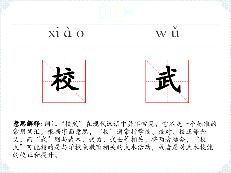 由于“校武”不是一个常用词汇,其词源和演变不太明确。可能是由“校”和“武”两个字组合而成,用以描述特定的武术活动。