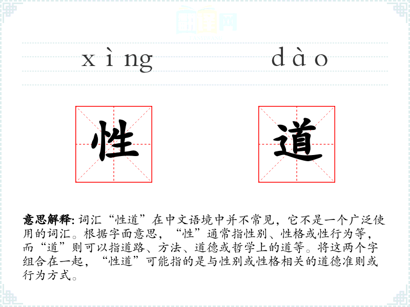 - 反义词:无(由于“性道”不是一个常用词汇,反义词不明确)