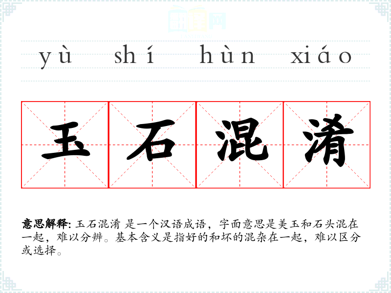 玉石混淆 是一个汉语成语,字面意思是美玉和石头混在一起,难以分辨。基本含义是指好的和坏的混杂在一起,难以区分或选择。
