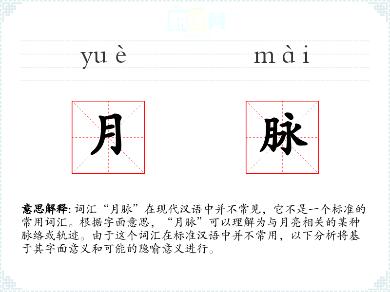 词汇“月脉”在现代汉语中并不常见,它不是一个标准的常用词汇。根据字面意思,“月脉”可以理解为与月亮相关的某种脉络或轨迹。由于这个词汇在标准汉语中并不常用,以下分析将基于其字面意义和可能的隐喻意义进行。