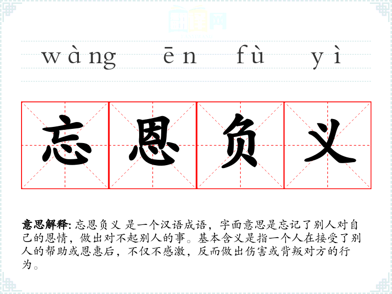 忘恩负义 是一个汉语成语,字面意思是忘记了别人对自己的恩情,做出对不起别人的事。基本含义是指一个人在接受了别人的帮助或恩惠后,不仅不感激,反而做出伤害或背叛对方的行为。