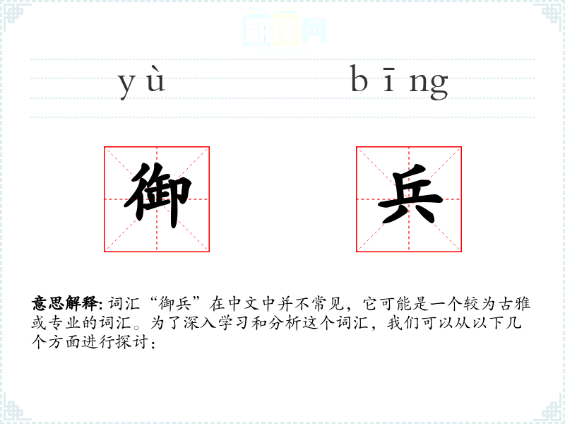 词汇“御兵”在中文中并不常见,它可能是一个较为古雅或专业的词汇。为了深入学*和分析这个词汇,我们可以从以下几个方面进行探讨: