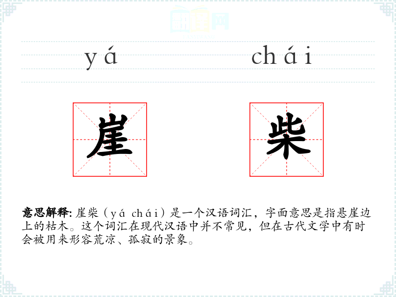 崖柴(yá chái)是一个汉语词汇,字面意思是指悬崖边上的枯木。这个词汇在现代汉语中并不常见,但在古代文学中有时会被用来形容荒凉、孤寂的景象。