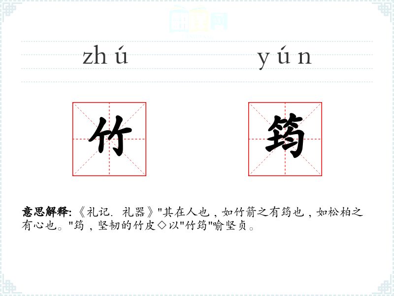 《礼记.礼器》"其在人也﹐如竹箭之有筠也﹐如松柏之有心也。"筠﹐坚韧的竹皮◇以"竹筠"喻坚贞。