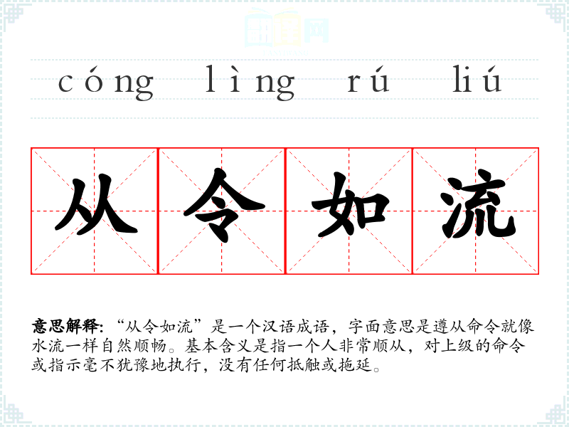 “从令如流”是一个汉语成语,字面意思是遵从命令就像水流一样自然顺畅。基本含义是指一个人非常顺从,对上级的命令或指示毫不犹豫地执行,没有任何抵触或拖延。