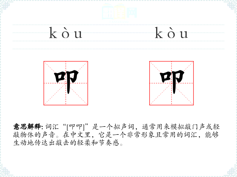 词汇“[叩叩]”是一个拟声词,通常用来模拟敲门声或轻敲物体的声音。在中文里,它是一个非常形象且常用的词汇,能够生动地传达出敲击的轻柔和节奏感。