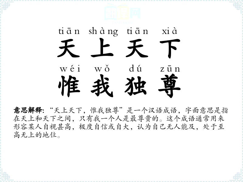 “天上天下,惟我独尊”是一个汉语成语,字面意思是指在天上和天下之间,只有我一个人是最尊贵的。这个成语通常用来形容某人自视甚高,极度自信或自大,认为自己无人能及,处于至高无上的地位。