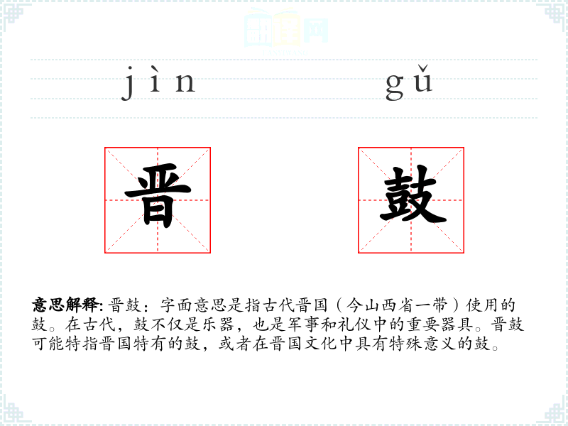 - 反义词:无(晋鼓作为一个特定文化背景下的词汇,没有直接的反义词)