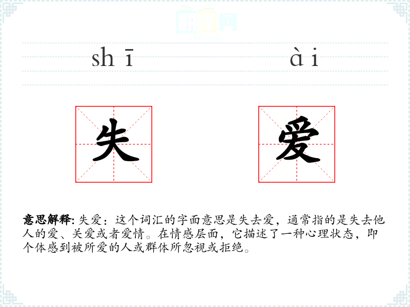 失爱:这个词汇的字面意思是失去爱,通常指的是失去他人的爱、关爱或者爱情。在情感层面,它描述了一种心理状态,即个体感到被所爱的人或群体所忽视或拒绝。