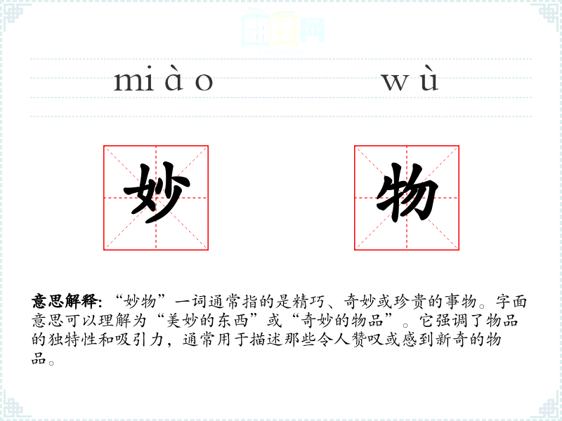 “妙物”一词通常指的是精巧、奇妙或珍贵的事物。字面意思可以理解为“美妙的东西”或“奇妙的物品”。它强调了物品的独特性和吸引力,通常用于描述那些令人赞叹或感到新奇的物品。
