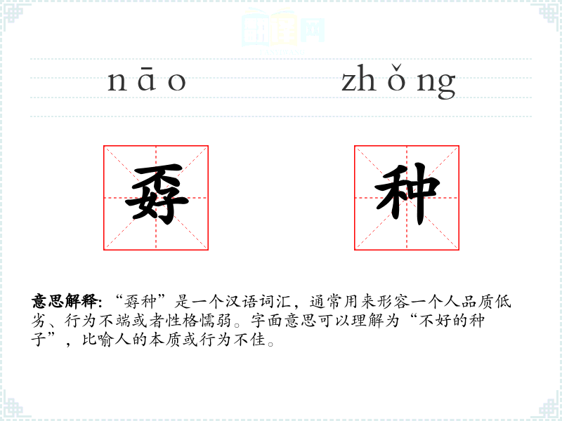 “孬种”是一个汉语词汇,通常用来形容一个人品质低劣、行为不端或者性格懦弱。字面意思可以理解为“不好的种子”,比喻人的本质或行为不佳。
