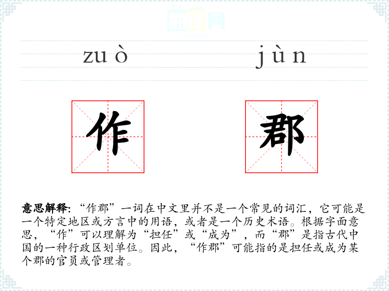 由于“作郡”不是一个标准汉语词汇,它在不同语境下的使用可能非常有限。在历史文献或古代文学中,可能会出现这个词,用以描述某人担任郡守或郡长的职务。在现代汉语中,这个词可能不会被广泛使用,除非是在特定的历史研究或方言研究中。