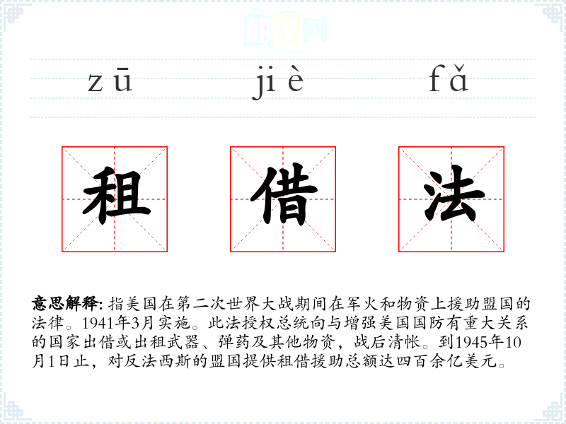 1.指美国在第二次世界大战期间在军火和物资上援助盟国的法律。1941年3月实施。此法授权总统向与增强美国国防有重大关系的国家出借或出租武器、弹药及其他物资,战后清帐。到1945年10月1日止,对反法西斯的盟国提供租借援助总额达四百余亿美元。