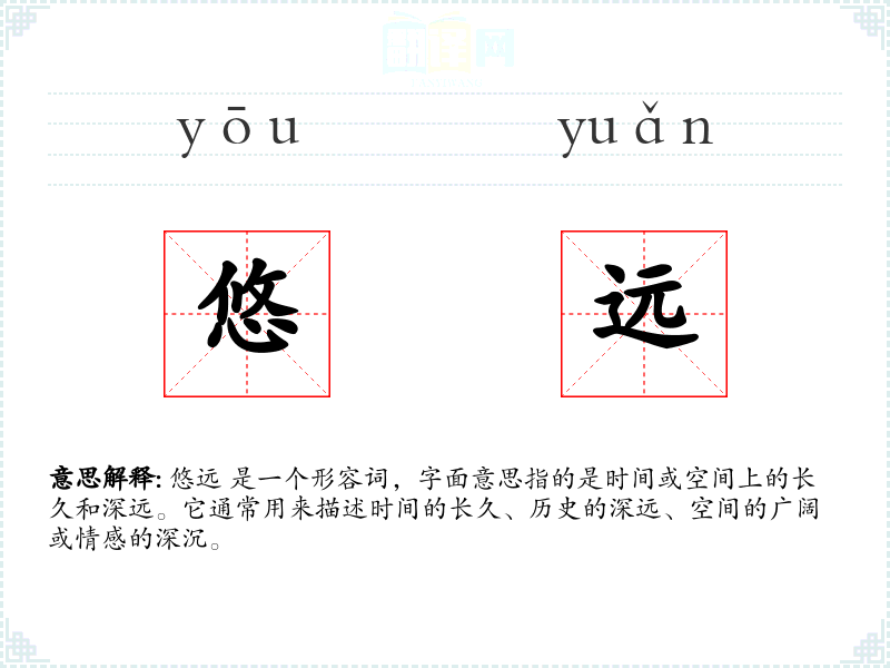 悠远 是一个形容词,字面意思指的是时间或空间上的长久和深远。它通常用来描述时间的长久、历史的深远、空间的广阔或情感的深沉。