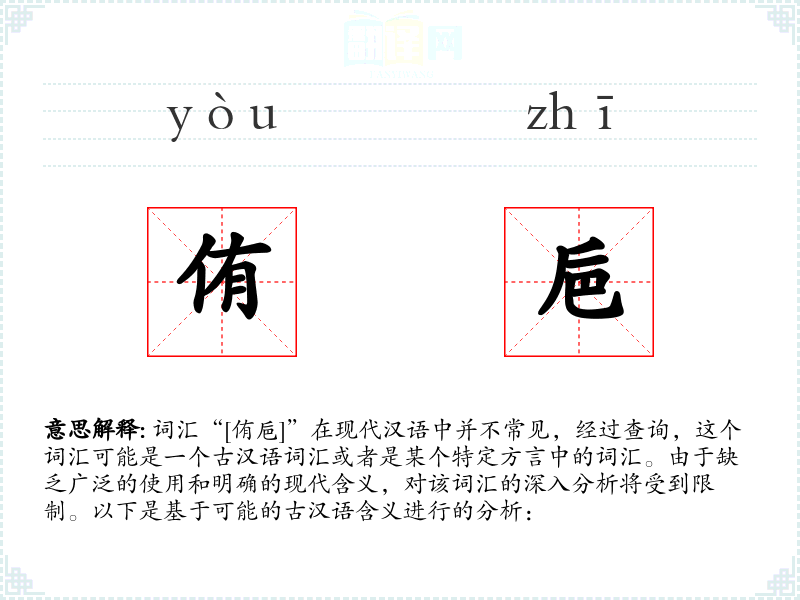 词汇“[侑巵]”在现代汉语中并不常见,经过查询,这个词汇可能是一个古汉语词汇或者是某个特定方言中的词汇。由于缺乏广泛的使用和明确的现代含义,对该词汇的深入分析将受到限制。以下是基于可能的古汉语含义进行的分析: