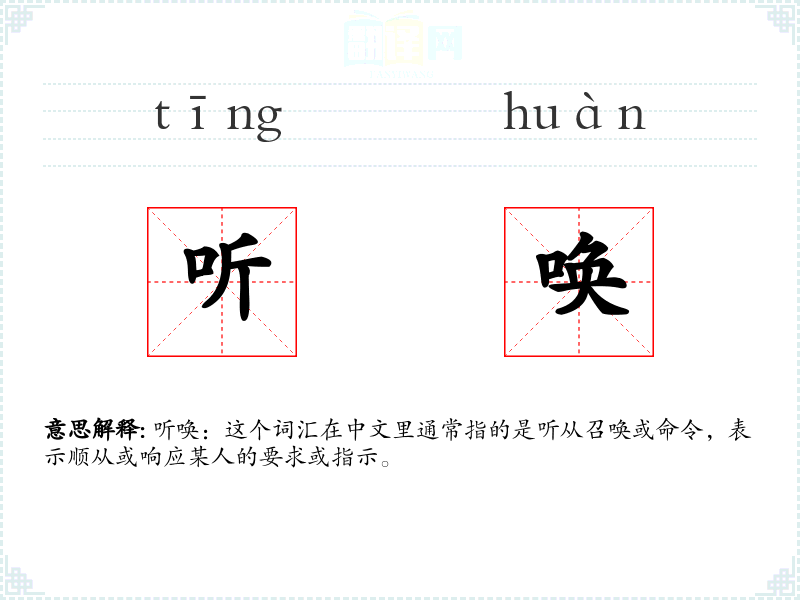 “听唤”由“听”和“唤”两个字组成,“听”即听取,“唤”即呼唤或召唤。这个词在中文中的使用历史悠久,主要用于描述听从召唤的行为。