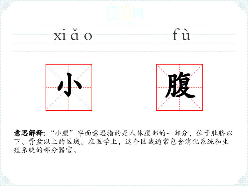 “小腹”一词在中文中历史悠久,其字面结构“小”和“腹”分别表示“较小”和“腹部”,组合起来特指腹部的一部分。在古代文献中,“小腹”常与中医理论中的“丹田”等概念相关联,具有深厚的文化底蕴。
