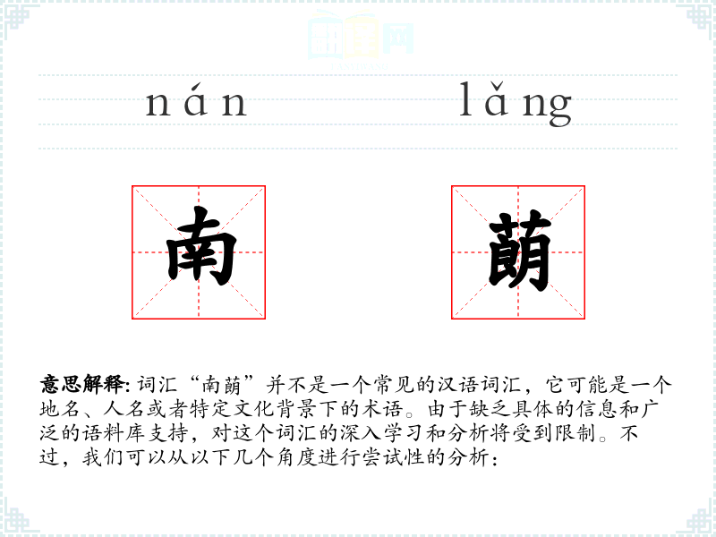 词汇“南蓢”并不是一个常见的汉语词汇,它可能是一个地名、人名或者特定文化背景下的术语。由于缺乏具体的信息和广泛的语料库支持,对这个词汇的深入学习和分析将受到限制。不过,我们可以从以下几个角度进行尝试性的分析: