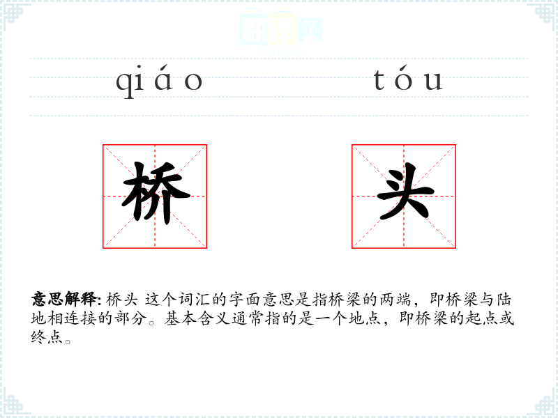 桥头 这个词汇的字面意思是指桥梁的两端,即桥梁与陆地相连接的部分。基本含义通常指的是一个地点,即桥梁的起点或终点。