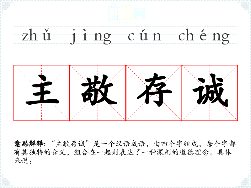 “主敬存诚”是一个汉语成语,由四个字组成,每个字都有其独特的含义,组合在一起则表达了一种深刻的道德理念。具体来说: