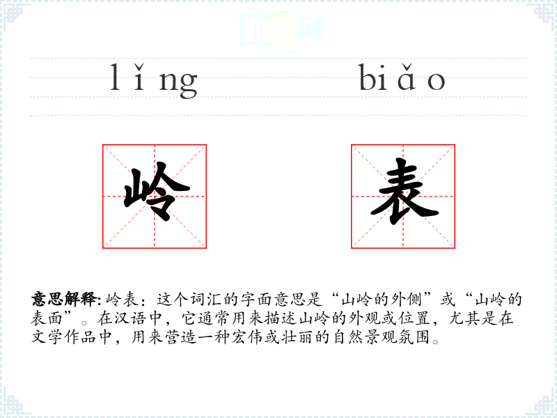 “岭表”一词源自古代汉语,其中“岭”指山岭,“表”指表面或外侧。随着时间的推移,这个词汇在文学作品中得到了广泛的应用,尤其是在描绘自然景观时。