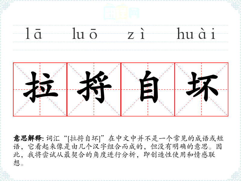 尽管“[拉捋自坏]”不是一个明确的词汇,通过创造性使用和情感联想,我们可以尝试赋予它一些意义和情感。在语言学习和表达中,这种创造性的尝试可以帮助我们更好地理解和运用语言。