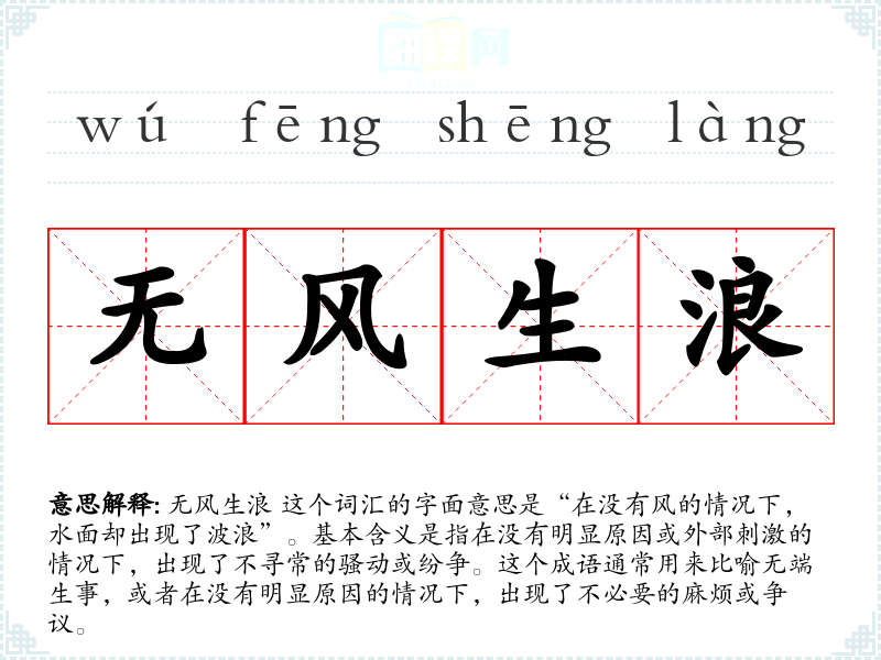 无风生浪 这个词汇的字面意思是“在没有风的情况下,水面却出现了波浪”。基本含义是指在没有明显原因或外部刺激的情况下,出现了不寻常的骚动或纷争。这个成语通常用来比喻无端生事,或者在没有明显原因的情况下,出现了不必要的麻烦或争议。