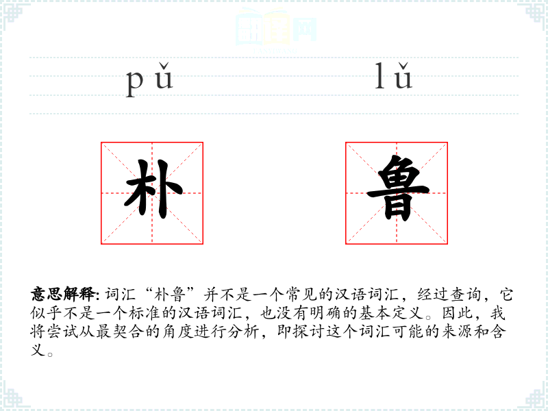 由于“朴鲁”不是一个标准的汉语词汇,我们无法给出一个确切的字面意思和基本含义。它可能是某个方言词汇、古文词汇或者是某个特定领域的术语。