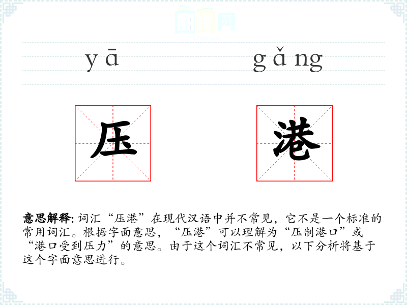 词汇“压港”在现代汉语中并不常见,它不是一个标准的常用词汇。根据字面意思,“压港”可以理解为“压制港口”或“港口受到压力”的意思。由于这个词汇不常见,以下分析将基于这个字面意思进行。