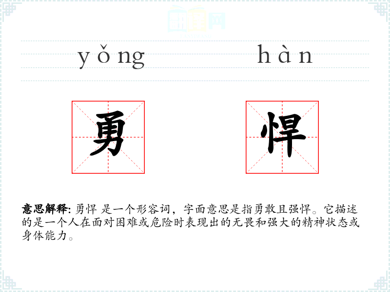 勇悍 是一个形容词,字面意思是指勇敢且强悍。它描述的是一个人在面对困难或危险时表现出的无畏和强大的精神状态或身体能力。
