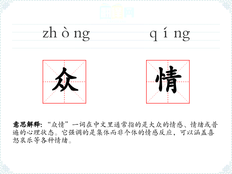 “众情”一词在中文里通常指的是大众的情感、情绪或普遍的心理状态。它强调的是集体而非个体的情感反应,可以涵盖喜怒哀乐等各种情绪。