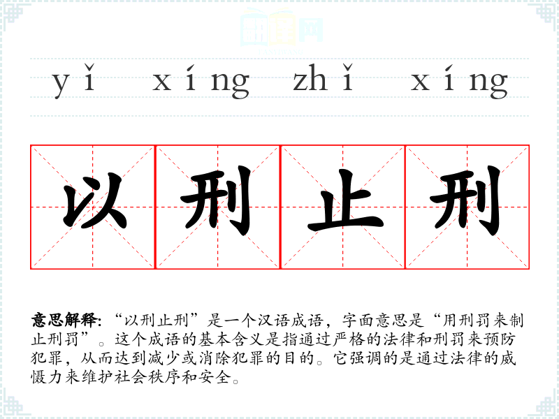 “以刑止刑”是一个汉语成语,字面意思是“用刑罚来制止刑罚”。这个成语的基本含义是指通过严格的法律和刑罚来预防犯罪,从而达到减少或消除犯罪的目的。它强调的是通过法律的威慑力来维护社会秩序和安全。
