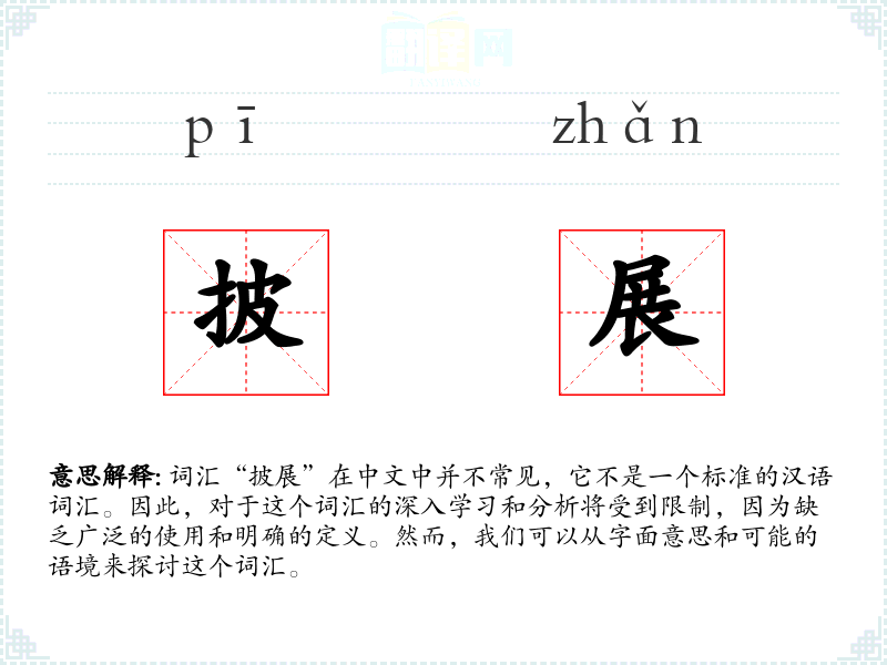 词汇“披展”在中文中并不常见,它不是一个标准的汉语词汇。因此,对于这个词汇的深入学习和分析将受到限制,因为缺乏广泛的使用和明确的定义。然而,我们可以从字面意思和可能的语境来探讨这个词汇。