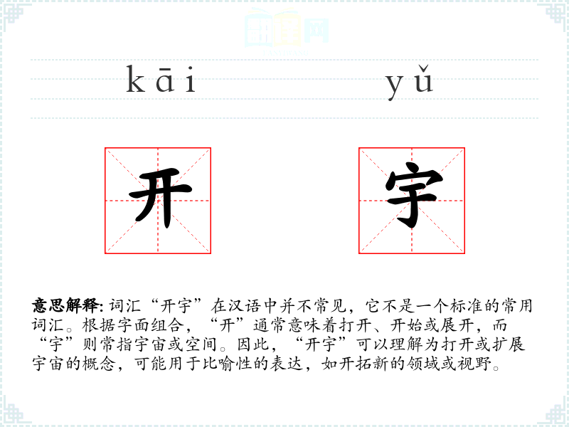 词汇“开宇”在汉语中并不常见,它不是一个标准的常用词汇。根据字面组合,“开”通常意味着打开、开始或展开,而“宇”则常指宇宙或空间。因此,“开宇”可以理解为打开或扩展宇宙的概念,可能用于比喻性的表达,如开拓新的领域或视野。