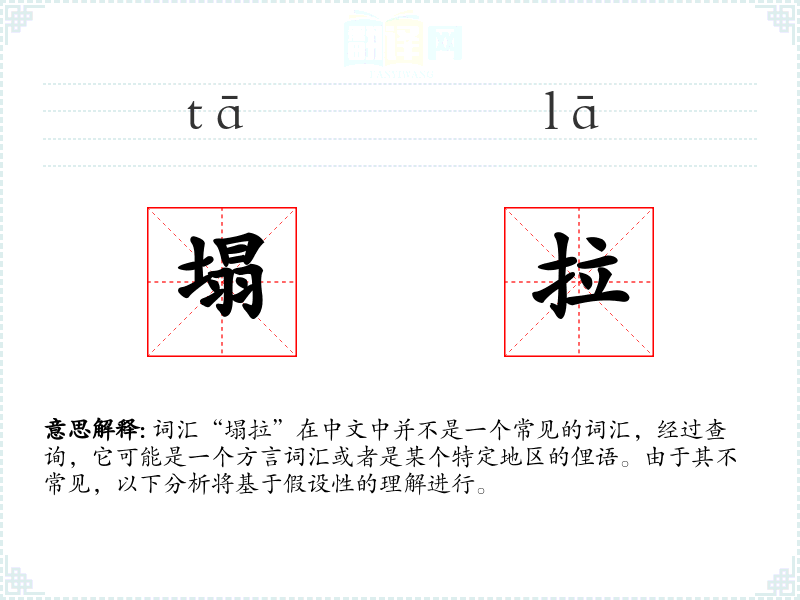 词汇“塌拉”在中文中并不是一个常见的词汇,经过查询,它可能是一个方言词汇或者是某个特定地区的俚语。由于其不常见,以下分析将基于假设性的理解进行。
