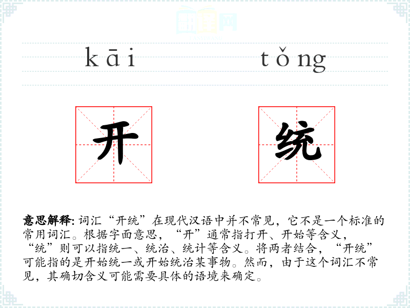 词汇“开统”在现代汉语中并不常见,它不是一个标准的常用词汇。根据字面意思,“开”通常指打开、开始等含义,“统”则可以指统一、统治、统计等含义。将两者结合,“开统”可能指的是开始统一或开始统治某事物。然而,由于这个词汇不常见,其确切含义可能需要具体的语境来确定。