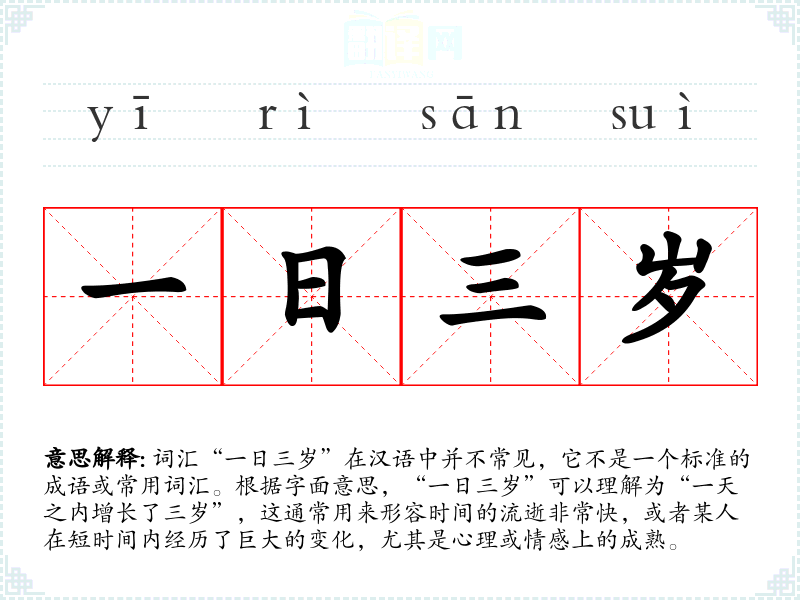 词汇“一日三岁”在汉语中并不常见,它不是一个标准的成语或常用词汇。根据字面意思,“一日三岁”可以理解为“一天之内增长了三岁”,这通常用来形容时间的流逝非常快,或者某人在短时间内经历了巨大的变化,尤其是心理或情感上的成熟。