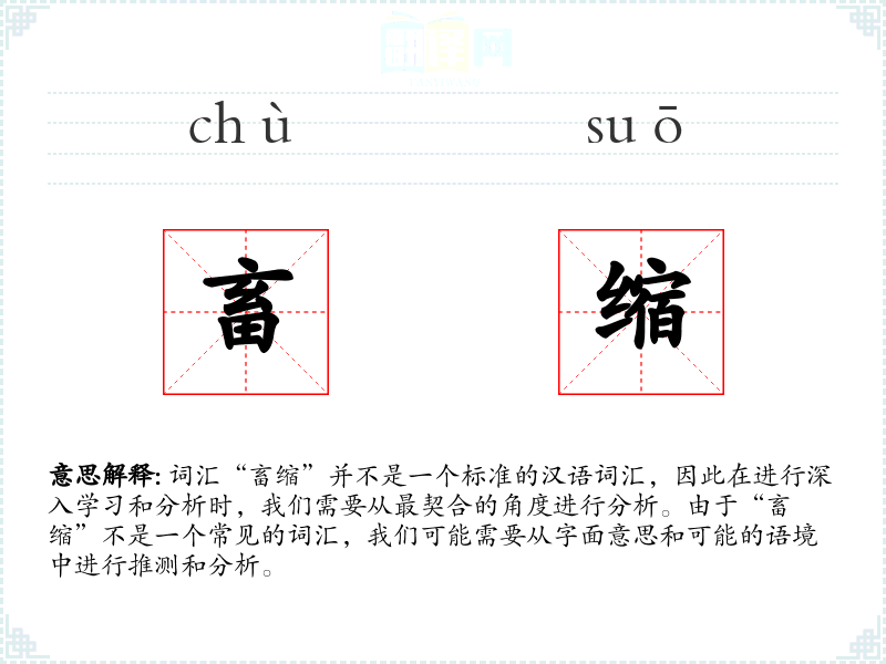 词汇“畜缩”并不是一个标准的汉语词汇,因此在进行深入学习和分析时,我们需要从最契合的角度进行分析。由于“畜缩”不是一个常见的词汇,我们可能需要从字面意思和可能的语境中进行推测和分析。