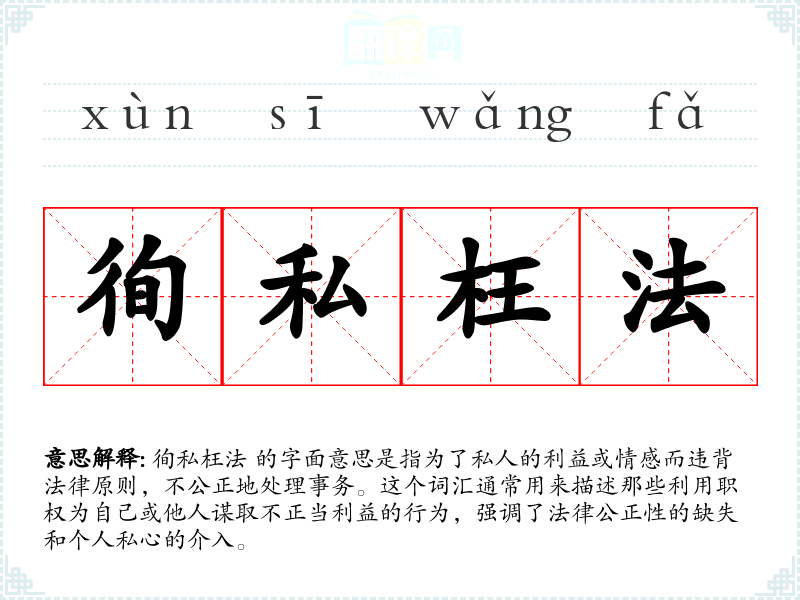 徇私枉法 的字面意思是指为了私人的利益或情感而违背法律原则,不公正地处理事务。这个词汇通常用来描述那些利用职权为自己或他人谋取不正当利益的行为,强调了法律公正性的缺失和个人私心的介入。