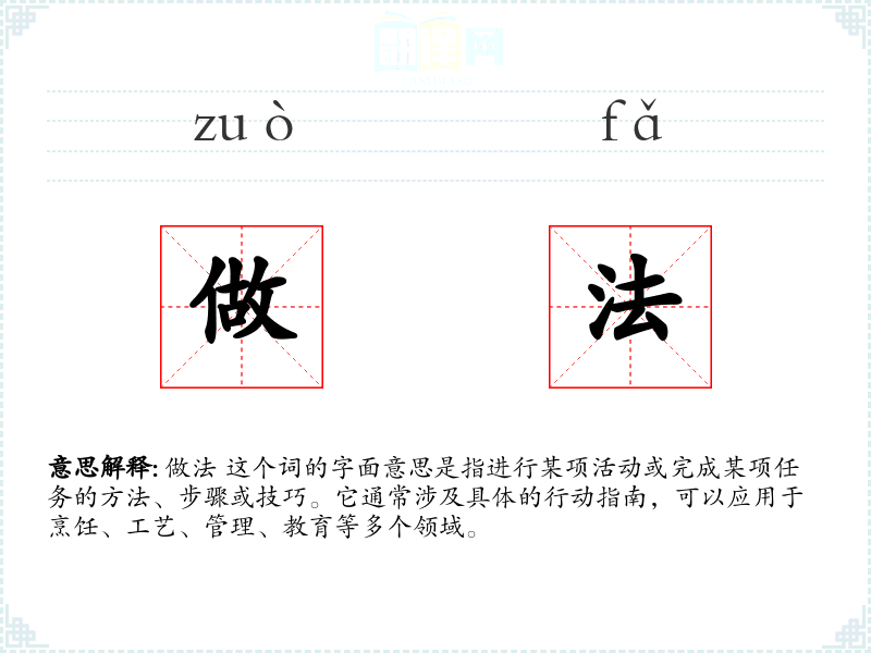 做法 这个词的字面意思是指进行某项活动或完成某项任务的方法、步骤或技巧。它通常涉及具体的行动指南,可以应用于烹饪、工艺、管理、教育等多个领域。