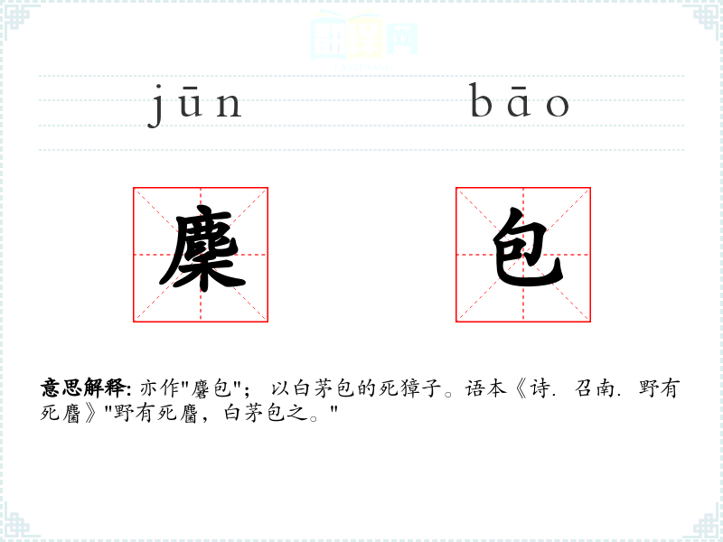 亦作"麏包"; 以白茅包的死獐子。语本《诗.召南.野有死麕》"野有死麕,白茅包之。"