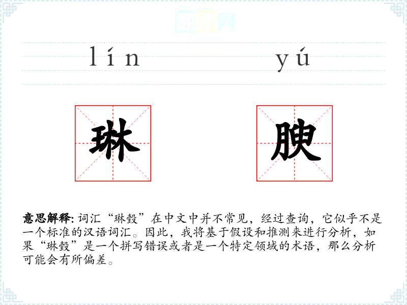词汇“琳瑴”在中文中并不常见,经过查询,它似乎不是一个标准的汉语词汇。因此,我将基于假设和推测来进行分析,如果“琳瑴”是一个拼写错误或者是一个特定领域的术语,那么分析可能会有所偏差。