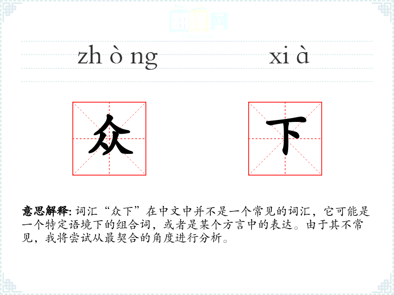 词汇“众下”在中文中并不是一个常见的词汇,它可能是一个特定语境下的组合词,或者是某个方言中的表达。由于其不常见,我将尝试从最契合的角度进行分析。