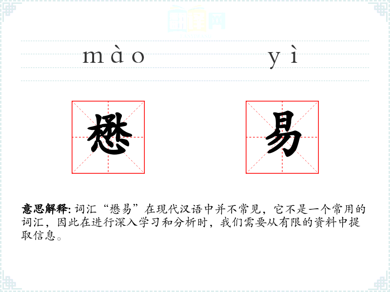 “懋”字在古代文献中较为常见,而“易”字则是一个非常古老的汉字,与《易经》有关,代表着变化和简易。两字结合的“懋易”在古代文献中可能较少见,其具体用法和含义可能需要进一步的历史文献研究。