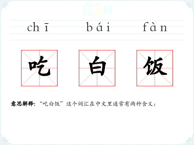 - 口语:在日常对话中,这个词汇常用来批评那些不劳而获的人,如“你不能总是吃白饭,得找点事情做。”