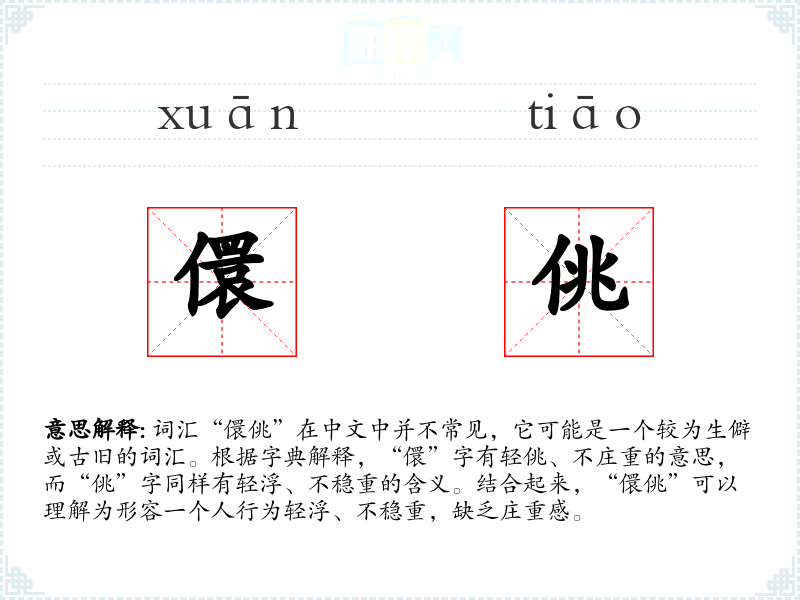 - 总结理解:“儇佻”是一个形容人行为轻浮、不稳重的词汇,虽然在现代汉语中使用频率不高,但在描述某些特定行为特征时仍有一定的应用价值。
